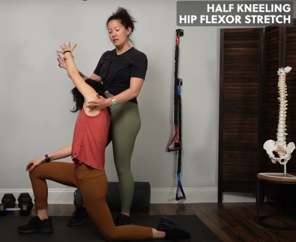 This exercise stretches the hip flexors and the lats, promoting a better pelvic position.