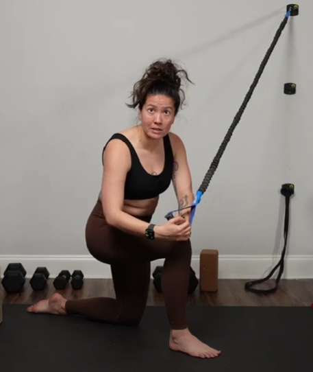 - Reach Up & Pull Down – Grab the resistance band and pull diagonally toward your front knee, engaging your obliques.