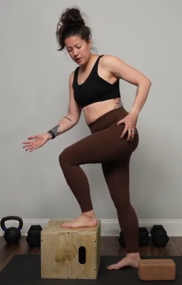 - Controlled Step Down – Slowly lower the opposite foot while keeping your belly close to your thigh.